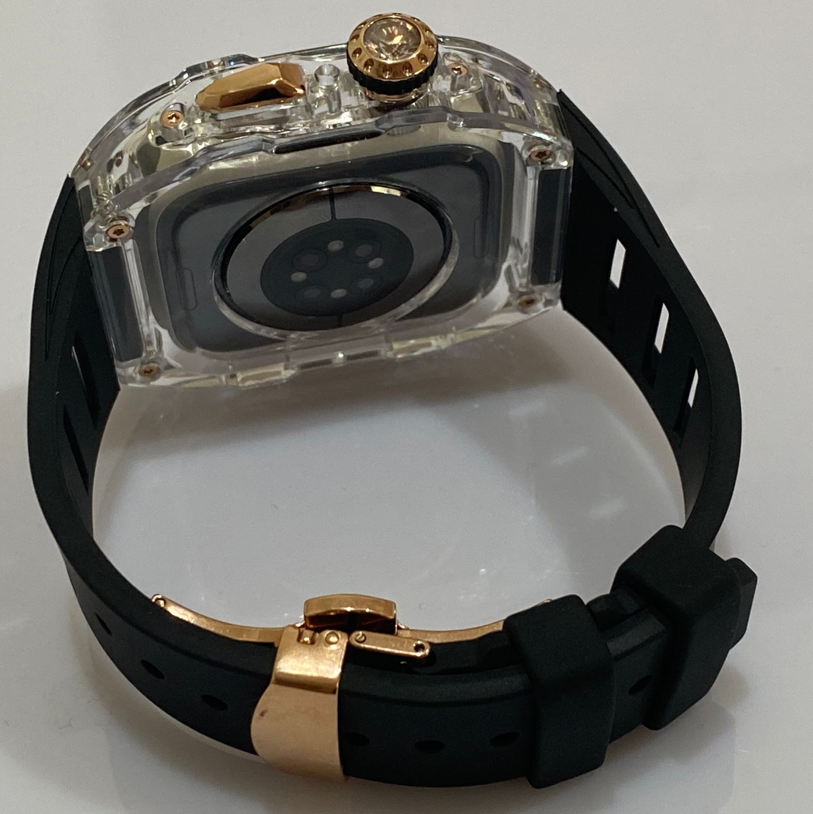 45mm ローズ-スモークブラック アップルウォッチバンド ラバーベルト カバー Apple Watch クリア ケース 4 5 6 7 8 se スポーツ メンズ レディース