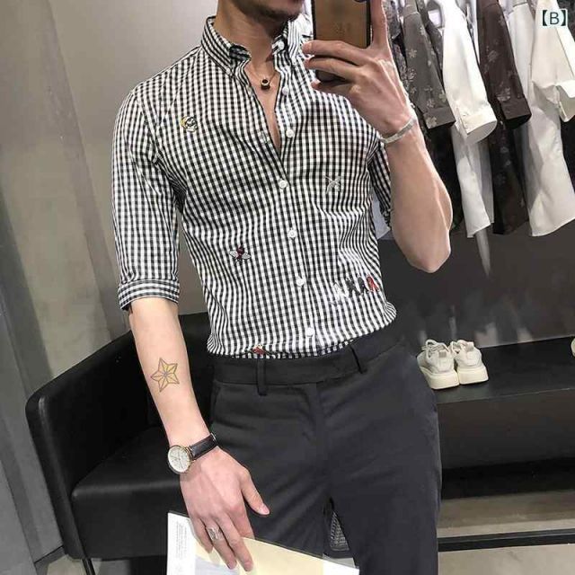 XL 春 コーデ メンズ 服 シンプル ファッション オシャレ 大人 かっこいい 大きいサイズ ストリート 紳士服 ストライプ シャツ 半袖 スリムフィット 七分袖 シャツ ハイエンド チェック柄 MEDICALDB_JP