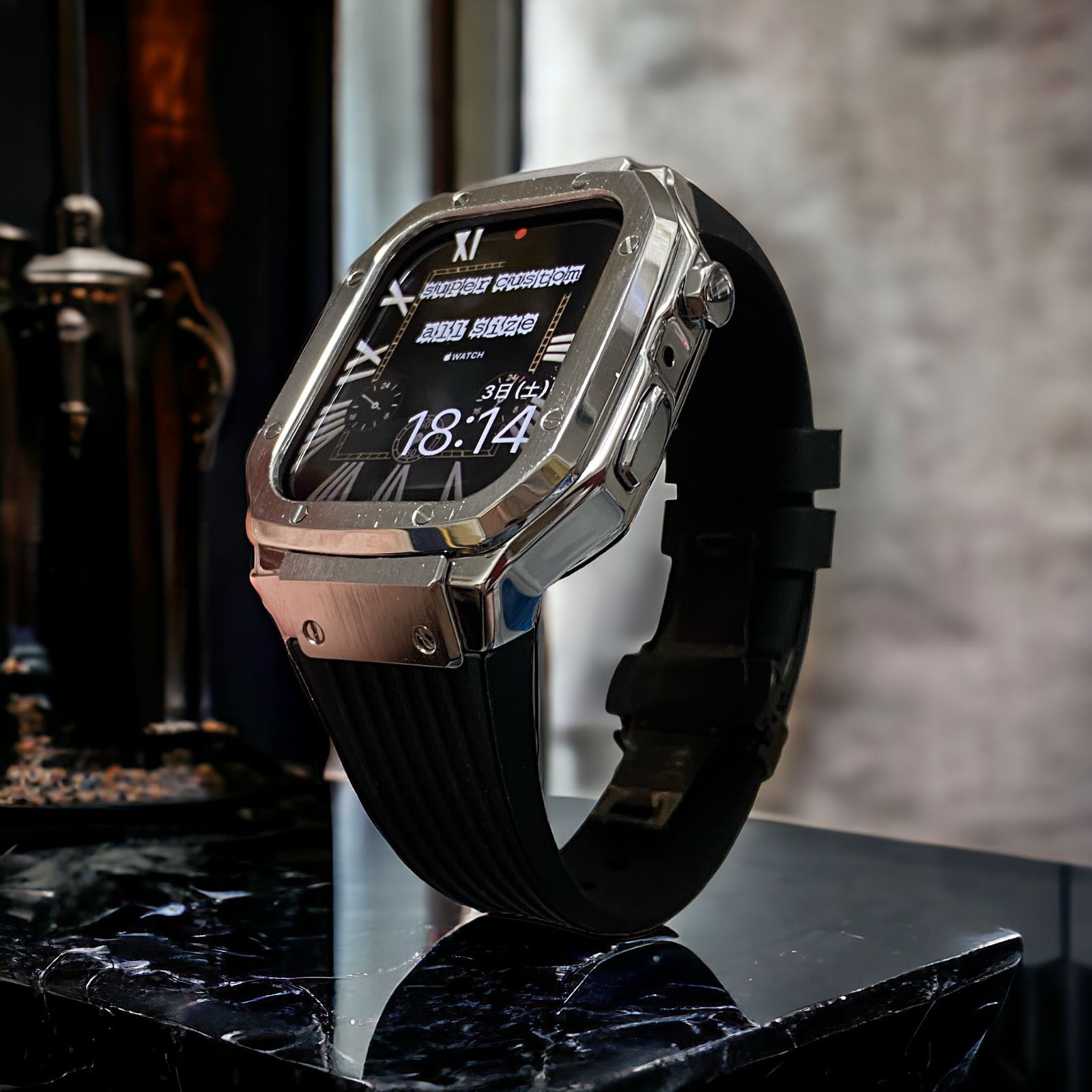 ブラックシルバー Apple Watch バンド ラバーベルト ステンレス316L メンズ レディース スポーツ 49mm45mm44mm42mm41mm40mm38mm