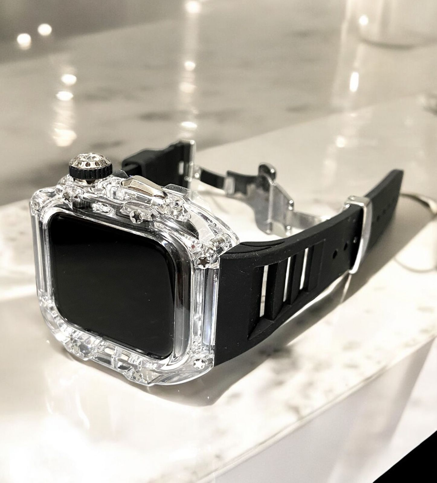 透明+黒 アップルウォッチバンド ラバーベルト カバー Apple Watch ケース 45mm. 44mm スポーツ