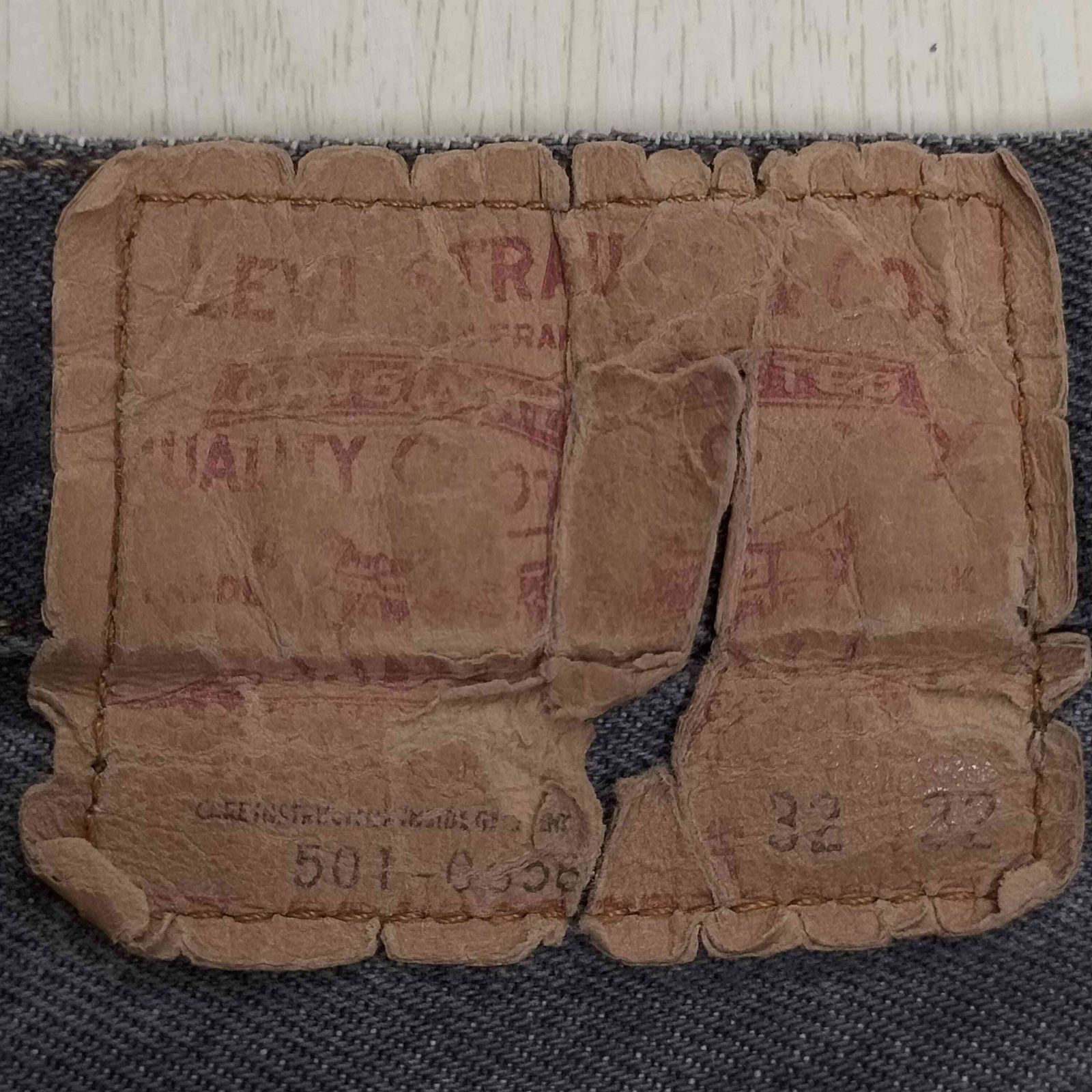 【状態詳細】パッチ、股部分に破れがございます。ウエストベルト部分を内側から見ると縫いなおしされている部分があるので通常のW32より縮みがあるかと存じます。
