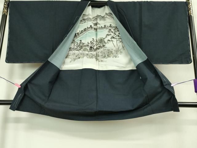 平和屋着物●男性 紬 アンサンブル 色無地 青褐色 キングサイズ 正絹 AABB1977ck