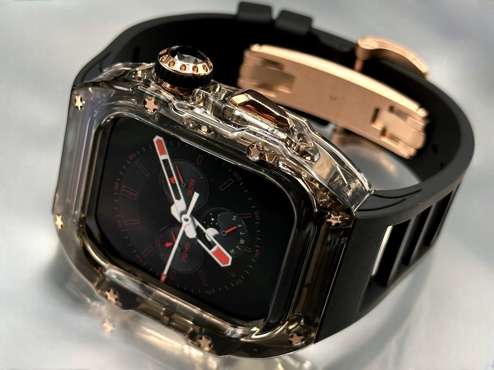 45mm用 スモークブラック-ローズ アップルウォッチバンド ラバーベルト カバー Apple Watch クリア ケース 4 5 6 7 8 9 se スポーツ メンズ レディース