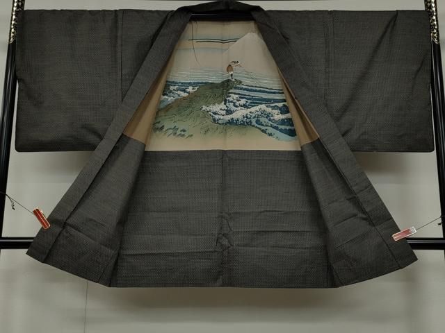 平和屋着物 上 男性 色無地 紋付き羽織セット 千鳥格子地紋 黒地 洗える着物 DZAA9351kh5
