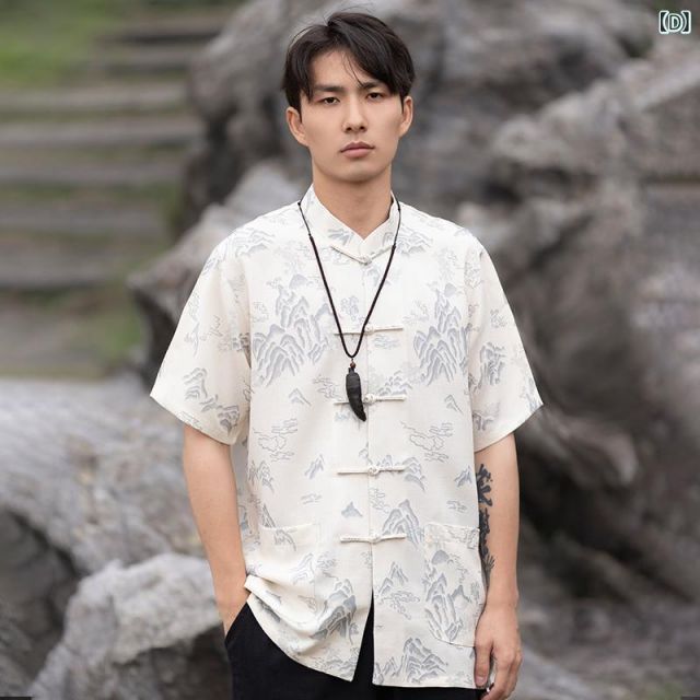 3XL メンズ ファッション 服 男性用 オシャレ シンプル 大人 かっこいい 大きいサイズ ストリート 紳士服 夏 スタイル トップス スタンドカラー ボタン 半袖 シャツ プリントチュニック スーツ カンフー 唐 スーツ 服 シャツ MEDICALDB_JP