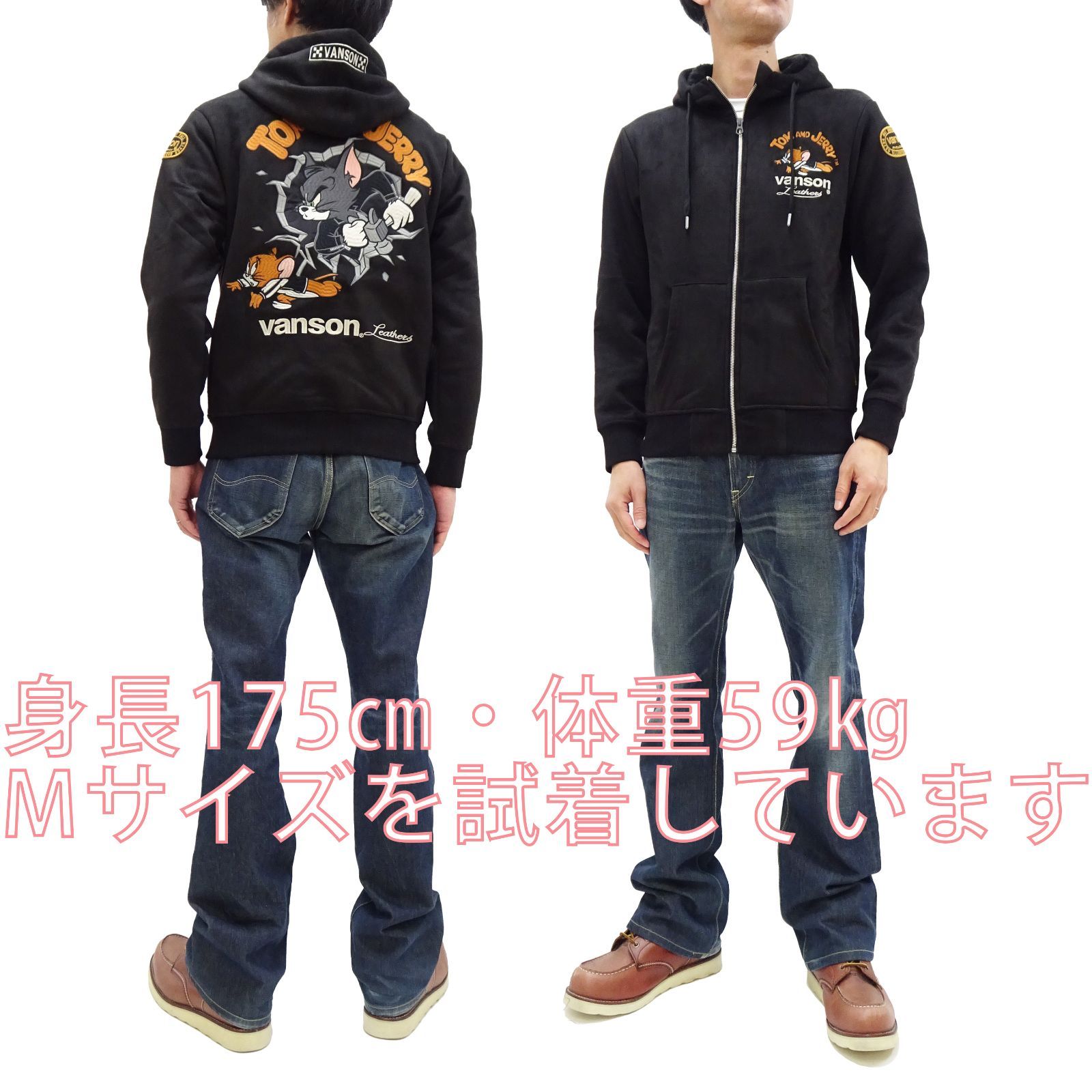 バンソン トム-ジェリー 裏ボア モイストスウェード ジップパーカー VANSON 総刺繍 ボンディング フーディ TJV-2535 ブラック 黒 MEDICALDB_JP