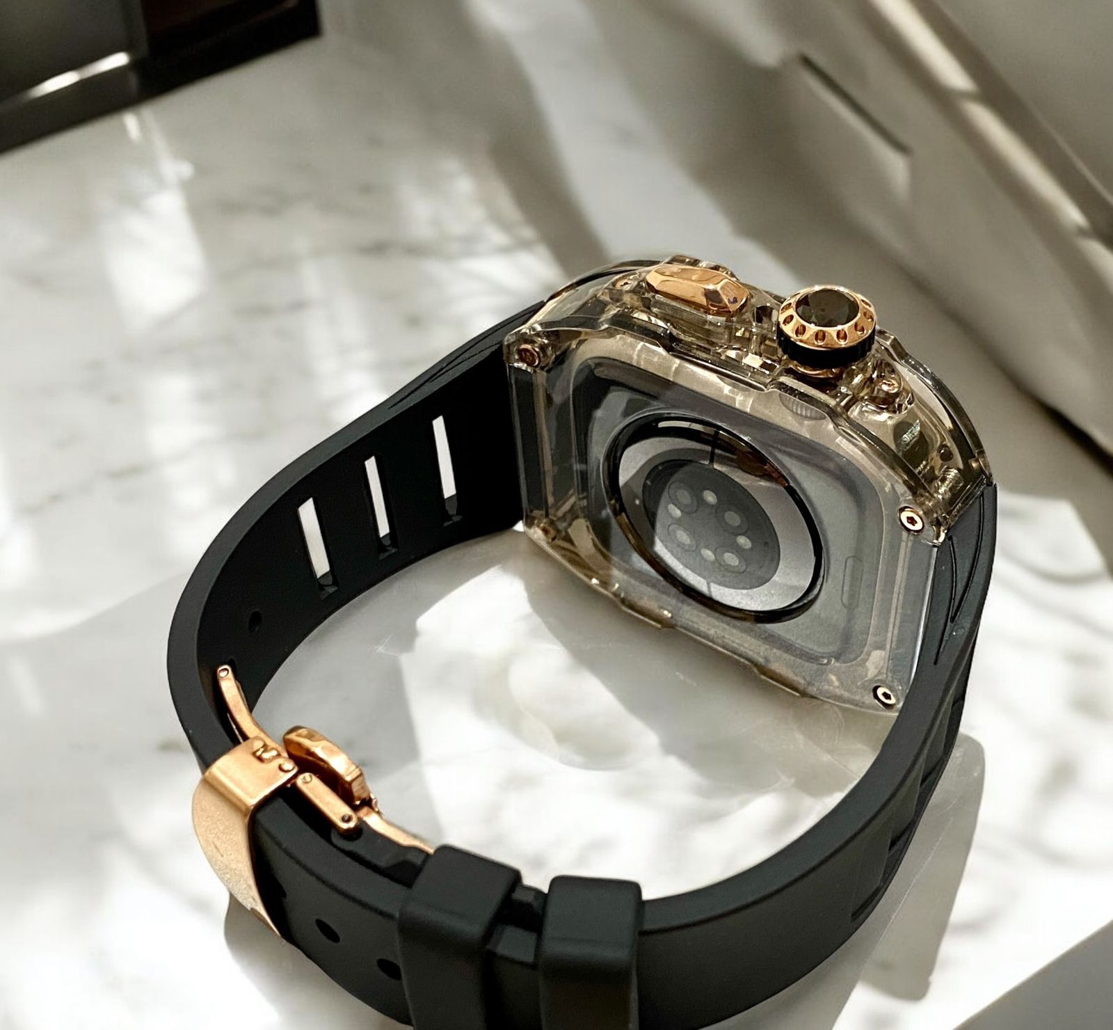 45mm ローズ-スモークブラック アップルウォッチバンド ラバーベルト カバー Apple Watch クリア ケース 4 5 6 7 8 se スポーツ メンズ レディース