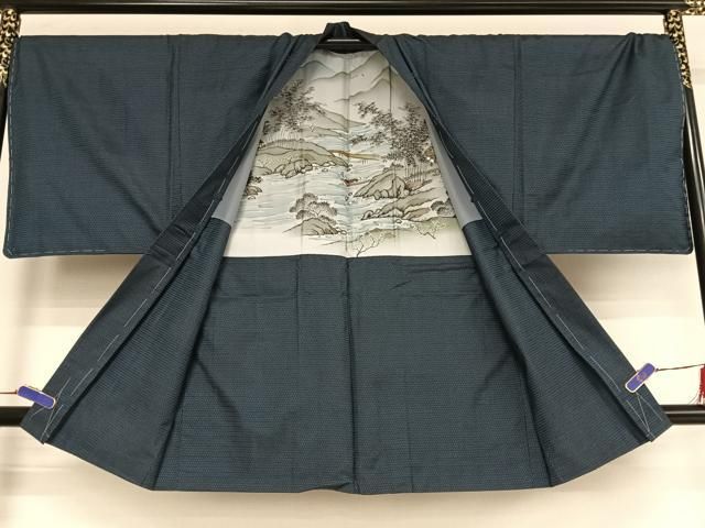 平和屋着物●男性 紬 アンサンブル 濃紺地 キングサイズ 正絹 ♥ AABB1962ck