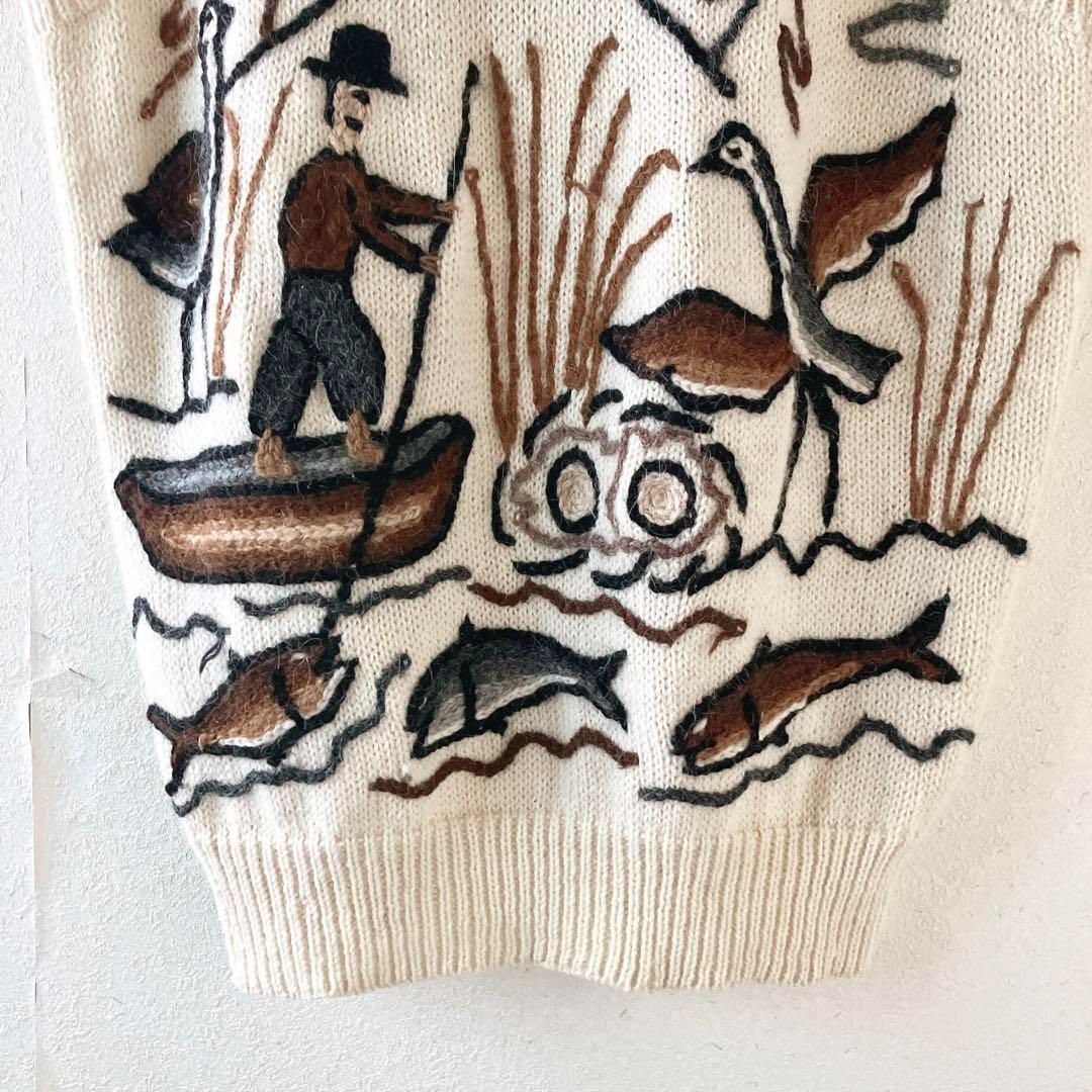 ハンドニット ペルー製 INCATEX インカテックス 総刺繍 ニット ベスト アルパカ 立体 3D刺繍 鳥 魚 人物 個性派 生成り アイボリー デザイン刺繍 レトロニット ヴィンテージ 一点物 3Ddesign knit MEDICALDB_JP