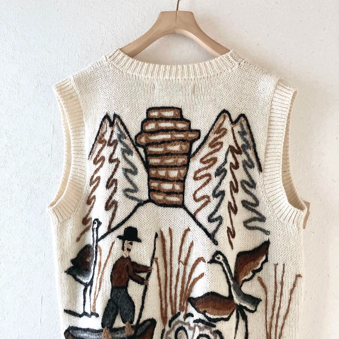 ハンドニット ペルー製 INCATEX インカテックス 総刺繍 ニット ベスト アルパカ 立体 3D刺繍 鳥 魚 人物 個性派 生成り アイボリー デザイン刺繍 レトロニット ヴィンテージ 一点物 3Ddesign knit MEDICALDB_JP
