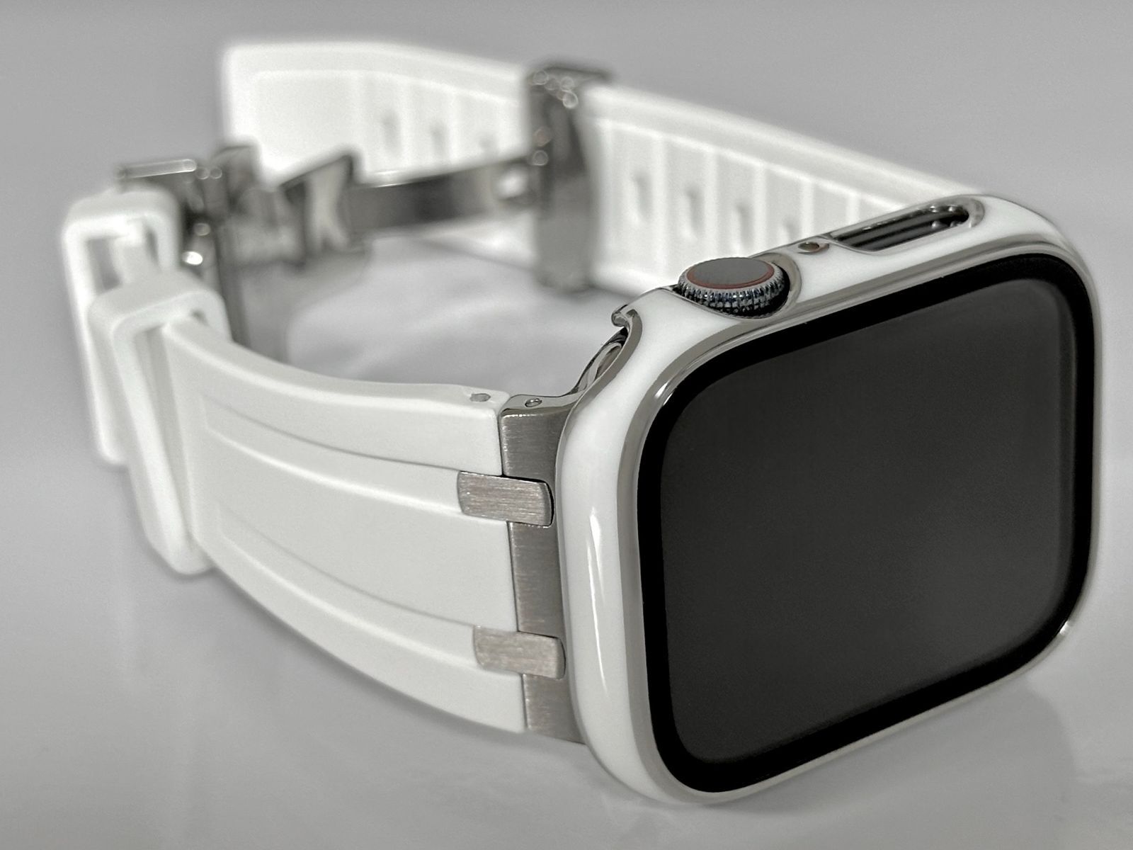ホワイトシルバー Apple Watchバンド ラバーベルト ステンレス アップルウォッチ画面保護カバー レーザー刻印ケース 40mm41mm44mm45mm46mm49mm ウルトラ ultra ultra2 MEDICALDB_JP