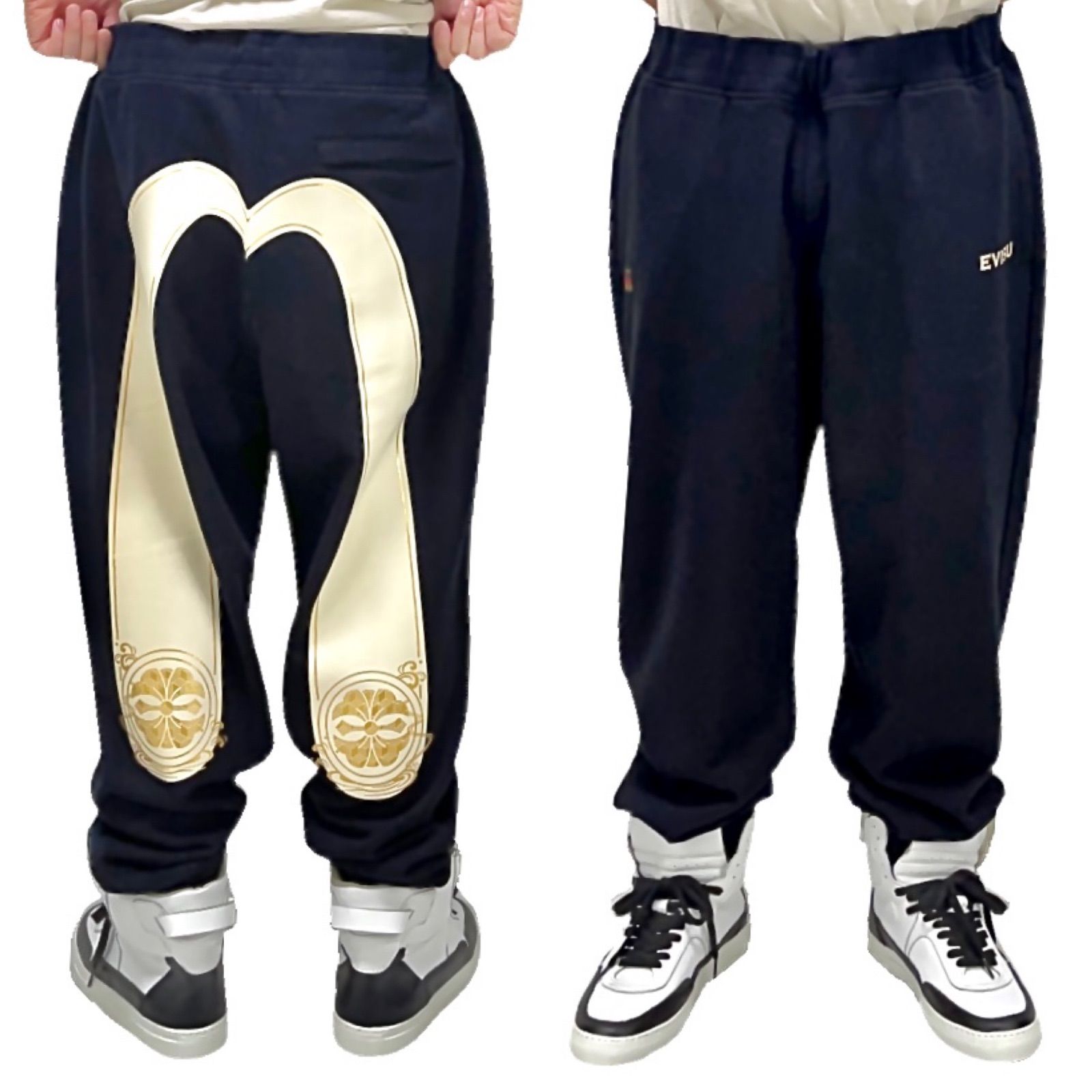 EVISU HERITAGE エビス エヴィス ヘリテージ バック カモメ ステッチ ゴールド 家紋 ビッグプリント ミディアムウエイト スウェット ジョガーパンツ 黒 ブラック 大阪 ストリート ジャパン デニム ジーンズ ブランド パリ 直営店 海外 MEDICALDB_JP