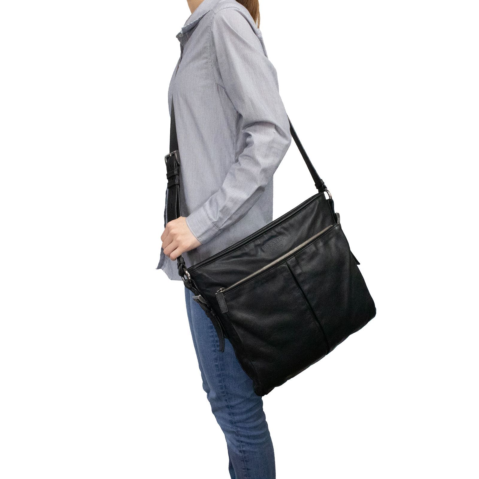 本物 送料無料 プラダ ショルダーバッグ クロスボディバッグ メッセンジャーバッグ メンズ レディース 黒 ブラック 珍しい モデル 肩掛け 斜め掛け A4対応 ロゴ マーク 本革 レザー シルバー金具 ハイブランド おしゃれ 鞄 バック A846 MEDICALDB_JP