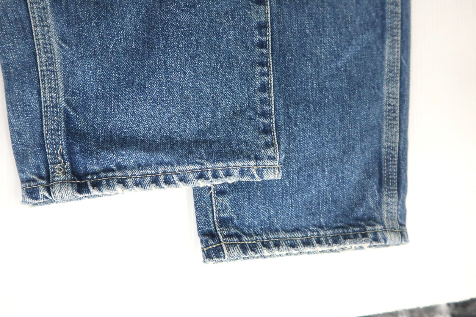各所にスレ、色落ち、膝に汚れ、後ポケットに補修跡、裾にほつれがあります。