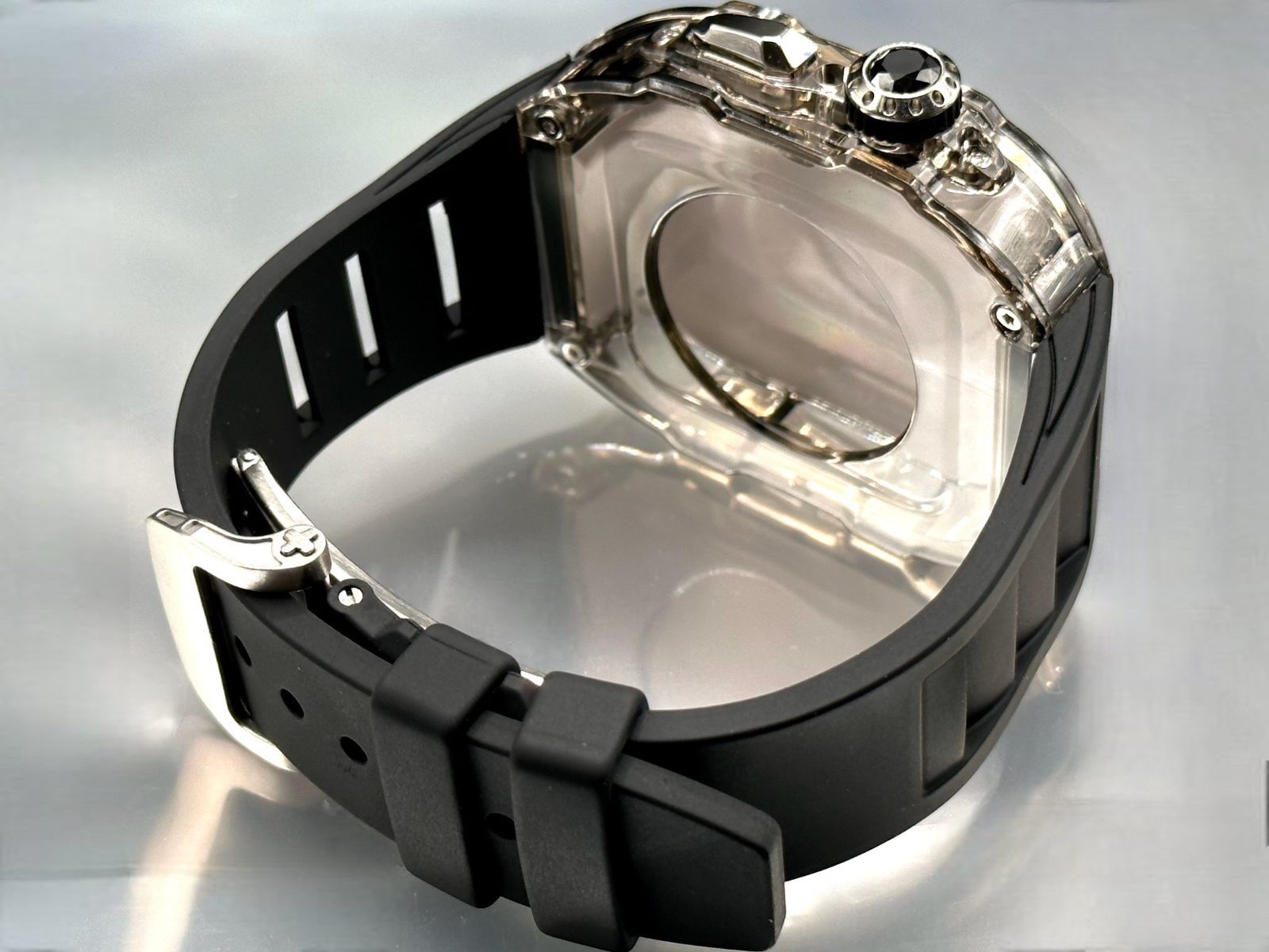 スモーク-ブラックシルバー アップルウォッチバンド ラバーベルト カバー Apple Watch クリア ケース 44mm 45mm 4 5 6 7 8 se スポーツ メンズ レディース MEDICALDB_JP