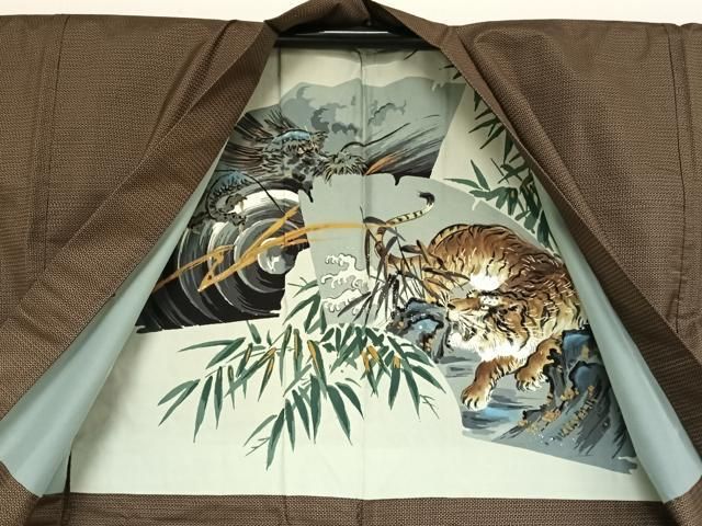 平和屋着物 上 男性 本場大島紬 アンサンブル 長襦袢 袷 長羽織セット 100亀甲 総詰め 羽裏 虎 ♥ DZAA9206kh5