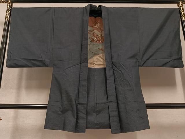 平和屋着物●男性 色紋付 羽織セット キングサイズ 長羽織 着物 御召御納戸色 羽織 百入茶色 正絹 DAAV6859ps