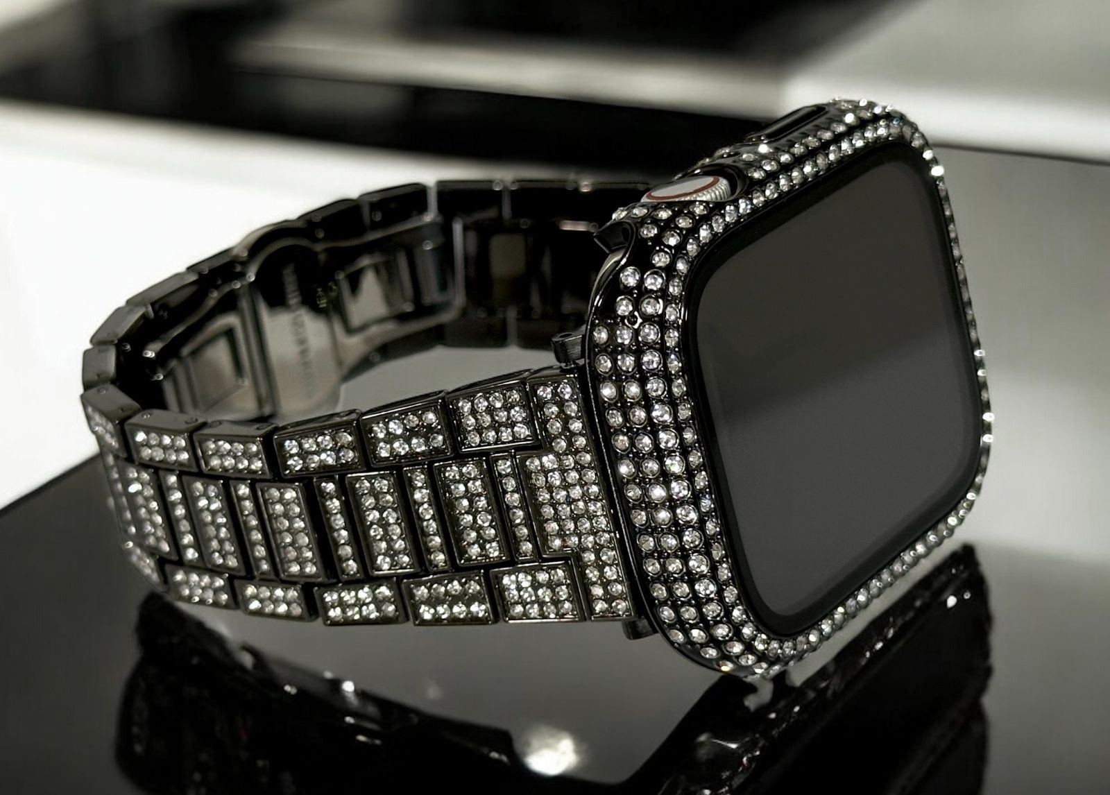 ブラック Apple Watchバンド ステンレスベルト アップルウォッチ画面保護カバー パヴェglassケース キラキラ クリスタル 41mm44mm45mm49mm ultra ウルトラ series10 42mm 46mm MEDICALDB_JP