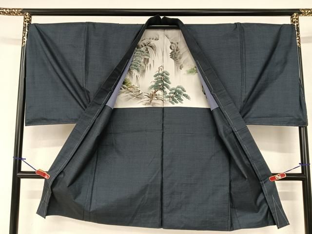 平和屋着物 上 男性 色無地 紋付き羽織セット 千鳥格子地紋 黒地 洗える着物 DZAA9351kh5