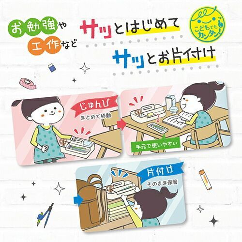 勉強セットや工作セットなど、必要なものまとめて整理整頓!片手で家じゅう持ち運べるから、サッとはじめてサッとお片付け!マグネットでピタッ!取り外せるトレイ付。浅めのトレイだから、必要なもの見つけやすい&取り出しやすい!スペースの半分は、仕切りがないので大きめのアイテムも収納できます。B5ノートまで可能。そのまま棚などに保管も可能です。いれるもの場所決めシール付!戻す場所を決めて整理整頓を身につけよう。【検索ハッシュタグ】#リビング学習#ソニック#sonic