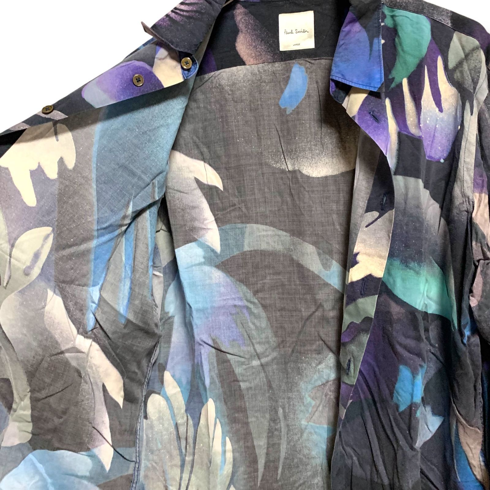 Paul Smith ポールスミス ブルー系 ボタニカル柄 長袖シャツ シルク メンズ 日本製 LARGE Lサイズ 上質素材 総柄 アート プリント カジュアル 001003H MEDICALDB_JP