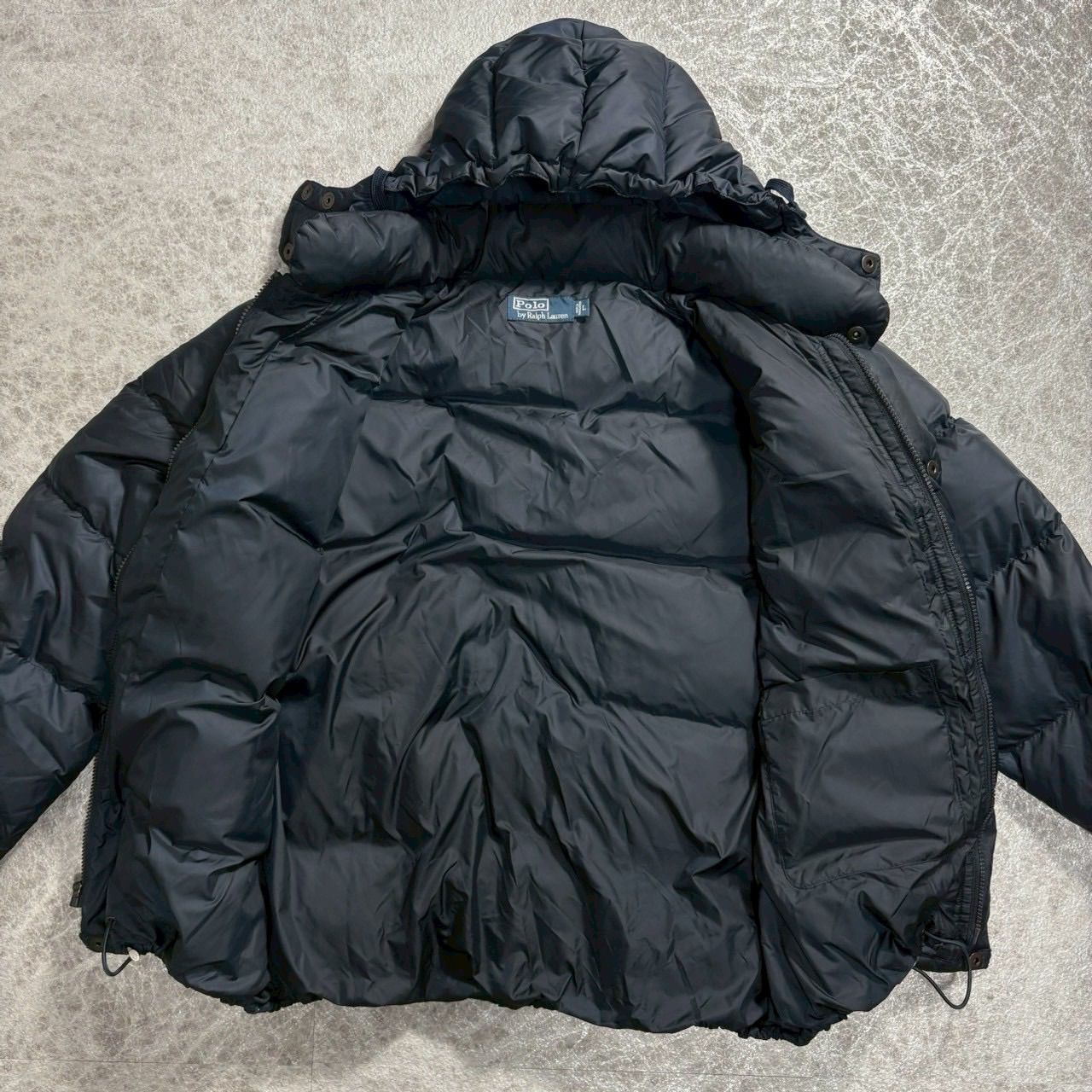 Polo by Ralph Lauren 90s ダウンジャケット ネイビー Lサイズ ラルフローレン フード付き アウター メンズ 古着 ポロ ダウンパファー ビンテージ ロゴ ボリューム 短丈 ドローコード MEDICALDB_JP